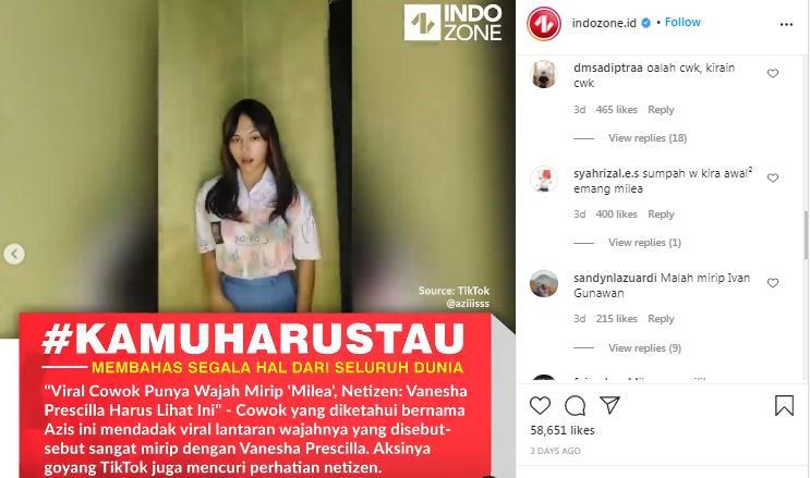 Belakangan ini, viral seorang cowok memiliki wajah yang sangat mirip dengan Vanesha Prescilla. Cowok bernama Aziz itu menggemparkan warganet lewat aksinya berjoget TikTok sambil mengenakan seragam SMA khas kostum Milea di film Dilan.