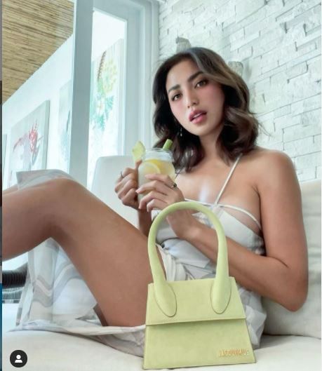 Dalam foto tersebut, Jedar nampak duduk di sofa sambil memegang secangkir minuman. Ia mengenakan dress pastel yang lumayan terbuka hingga membuat beberapa bagian tubuhnya terlihat.