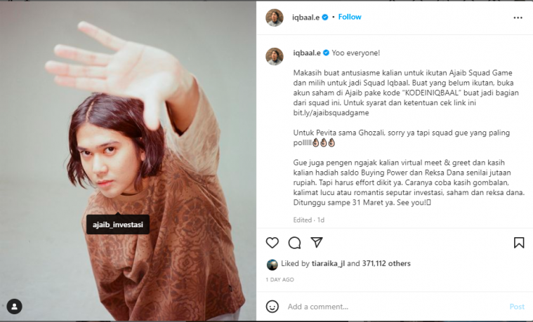 Jakarta, 8 Maret 2022 - Setelah sukses bagi-bagi saham total miliaran rupiah beberapa waktu lalu, kini Pevita dan Iqbaal kembali meramaikan jagat media sosial karena aksinya mencari pasukan untuk ikut Squad Game bersama Ajaib. Selain Pevita dan Iqbaal, platform investasi yang terdaftar dan diawasi oleh OJK ini juga menggandeng Ghozali Everyday untuk menggaet followers-nya bergabung ke dalam timnya.