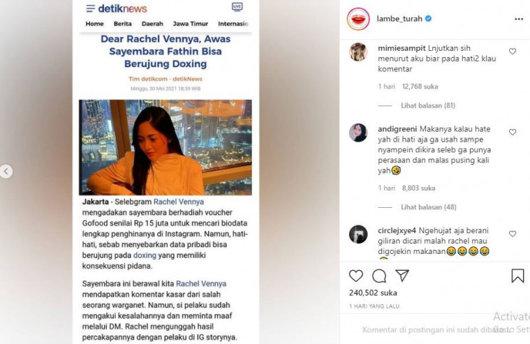 Namun, kesabaran Rachel Vennya ada batasnya. Diduga tak tahan dengan komentar jahat yang diterima, ia pun membuat sayembara untuk menemukan penghinanya di Instagram.