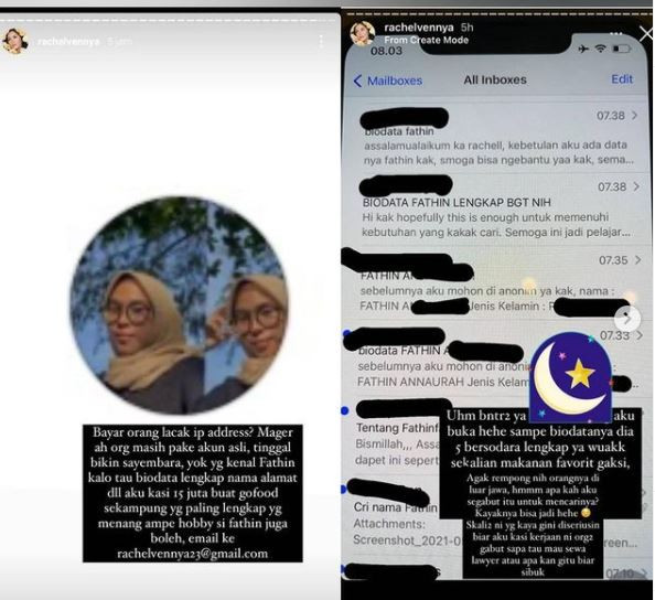Mantan istri Niko Al-Hakim itu pun menunjukkan tangkapan layar percakapannya dengan Fathin melalui story Instagram. Tidak hanya itu, Rachel Vennya juga mengunggah foto profil Fathin dan meminta netizen melacaknya dengan iming-iming hadiah Rp 15 juta.