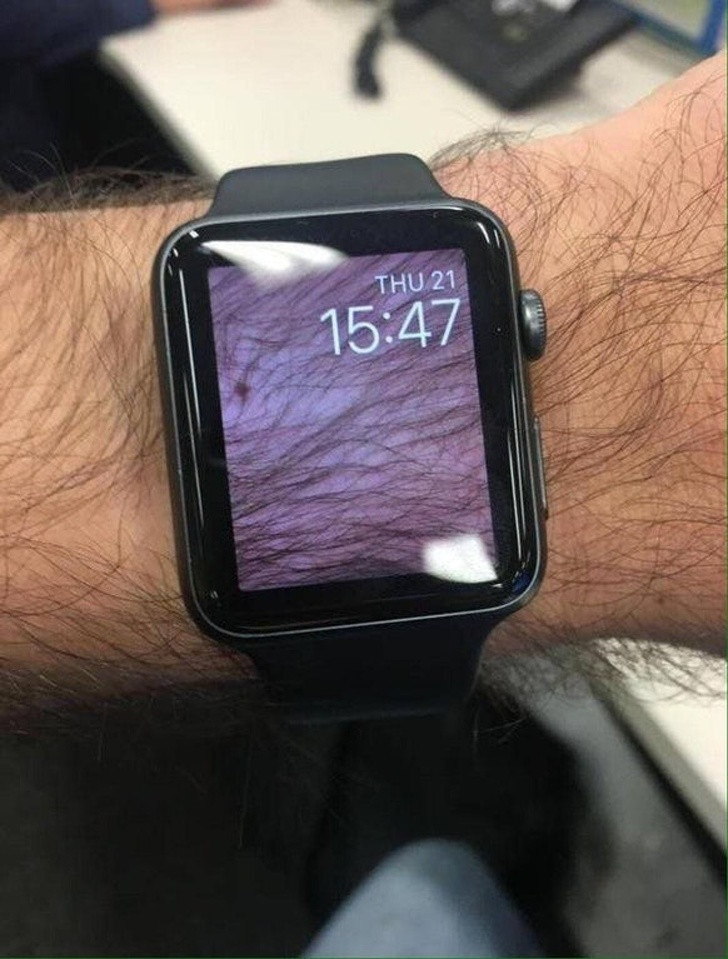 Tak disangka Apple watch satu ini bisa tembus pandang. Lihat saja layarnya yang tampak sama dengan kulit pria di atas.
