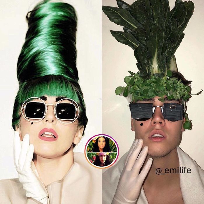 Walaupun bermodal sayur mayur dan kain putih saja, Emanuele bisa terlihat mempesona bak Lady Gaga. Bagaimana menurut kalian?