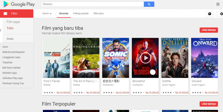 Untuk para pengguna Google dan Android, kamu bisa memaksimalkan menu Film & TV di aplikasi GooglePlay. Di sana sudah tersedia berbagai pilihan film yang bisa ditonton gratis atau disewa dengan harga yang terjangkau. Mulai dari Rp15-45 ribuan, tarifnya tergantung dari tahun rilis.