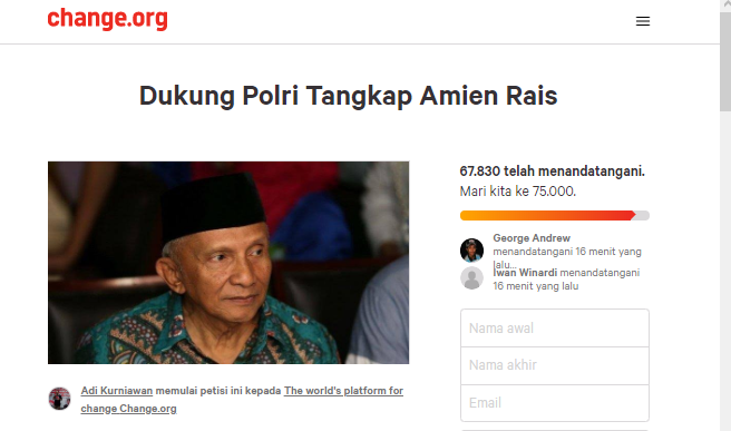 Baru-baru ini muncul petisi “Dukung Polri Tangkap Amien Rais” yang dimuat di situs petisi online. Petisi tersebut sampai saat ini sudah ditandatangani oleh 75 ribu orang.