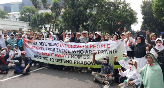 Muncul Massa Emak-emak Bermasker Tengah Menuju MK, Bawa Spanduk “Ini Bukan Untuk Bela Prabowo”