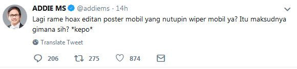 "Lagi rame hoax editan poster mobil yang nutupin wiper mobil ya? Itu maksudnya gimana sih? *kepo*," tulisnya.