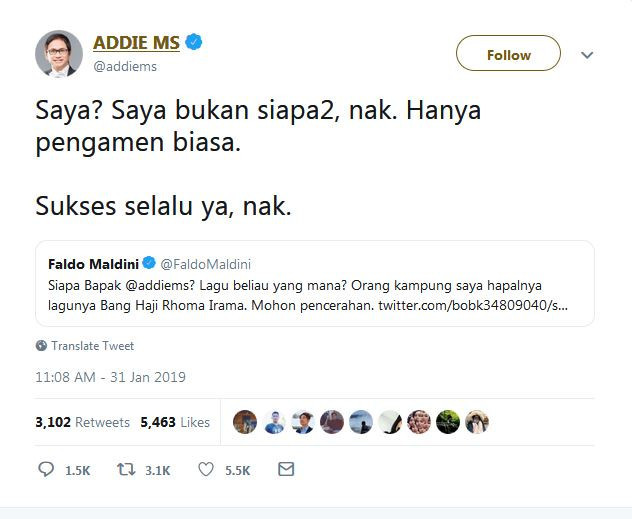 Cuitan Faldo lantas dikomentari langsung oleh Addie MS, dalam cuitan balasannya Addie MS mengaku ia hanyalah seorang pengamen biasa, lalu mendoakan Faldo Maldini agar sukses selalu.