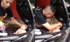 Manfaatkan Fasilitas Yang Ada, Pria Ini Gunakan Cara Unik Untuk Mandikan Bayinya