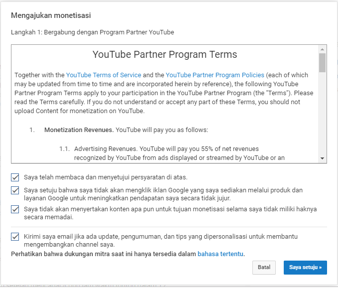 Baca dulu pengajuan permintaan monetisasi di point nomor satu. Klik Mulai. Di dalam formulir kamu bisa mengklik semua point sebagai tanda kamu telah membaca ketentuan. Lalu klik Setuju.
