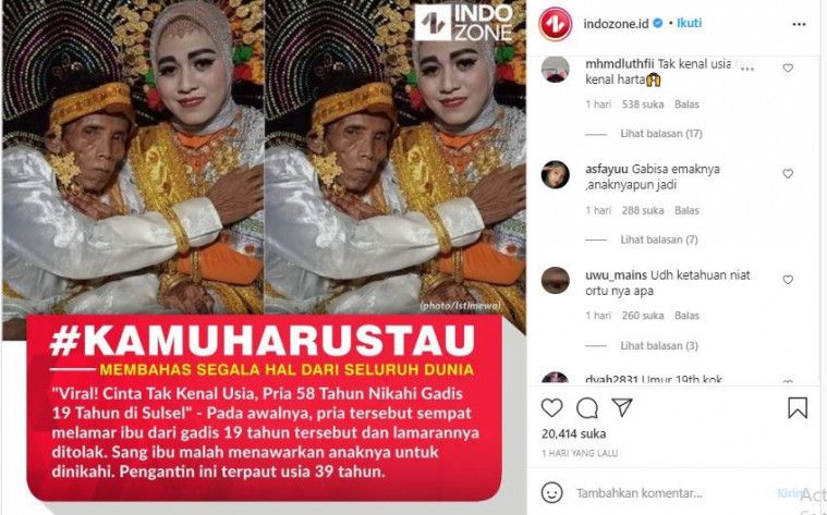 Pernikahan lintas generasi kembali menghebohkan warganet. Kali ini, pria lajang berusia 58 tahun bernama Bora viral lantaran menikahi seorang gadis berusia 19 tahun bernama Ira Fazillah. Komentar-komentar julid dari para warganet pun mewarnai kisah pernikahan pasangan asal Sulawesi Selatan tersebut.